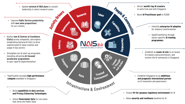 Singapore’s second National AI Strategy, or NAIS 2.0, outlines Singapore’s vision to be a place where AI serves as a force for good, and where the nation harnesses AI to uplift and empower its people and businesses. To achieve this vision and goals, the government will direct efforts under NAIS 2.0 toward 3 Systems, working through 10 Enablers (see Figure 1).
