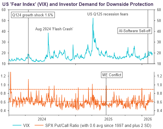 Given escalating tensions and the fluid situation, the heightened risk premium is reflected, especially in oil prices: Brent has jumped by 9% to USD 79.42 / barrel1, following supply disruptions, infrastructure impairment concerns, and lower shipping volumes along the Straits of Hormuz. However, other risk metrics are still much lower than last year’s Middle East crisis – especially the VIX Fear Index and investors’ demand for downside protection (as gauged from the put / call ratio trend on the S&P 500) – see Figure 1 below. The typical short-term impacts are an elevated US dollar, lower bond yields and higher gold prices – all these have unfolded so far.