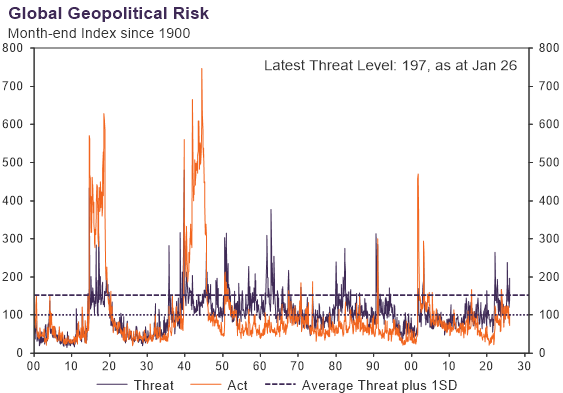 We maintain our 12-month positive outlook for risk assets – underpinned by ample liquidity, a robust global growth environment, productivity-led gains, and rising incomes (which supports wealth-backed spending). See our Q1 2025 FIV, Global Exceptionalism with the 4Rs for reasons as to why we hold a constructive view for global risk assets. Geopolitical shocks can be concerning, but thus far global investors have taken recent developments in their stride, largely because the credibility of the US’ military actions (and outcomes) remains high. See Figure 2 below suggesting contained global geopolitical risk versus historical spikes, and investors increased adaption to navigating higher threat levels for some time now.