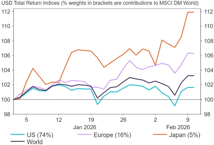 Figure 2: Positive DM equities performance YTD to February 10 (lagging EM Equities)