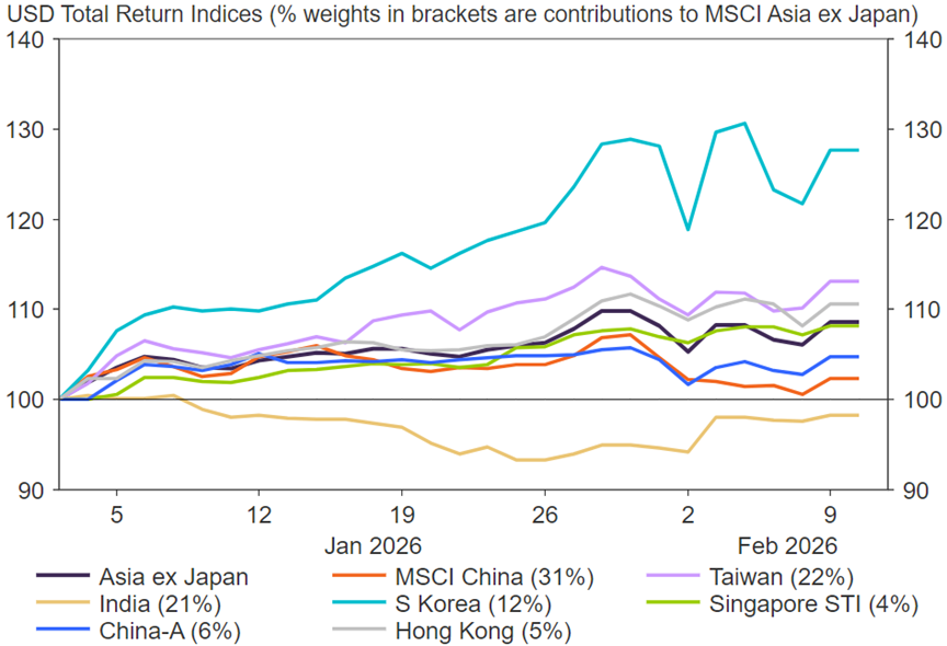 Figure 1: Strong Asia ex-Japan equities performance YTD to February 10 (outperforming DM Equities)