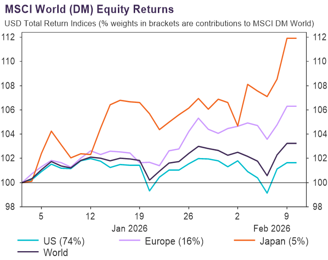 Figure 2: Positive DM equities performance YTD to February 10 (lagging EM Equities)