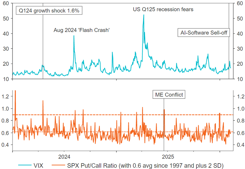 With most market corrections it is always challenging to judge how significant the forced selling may be, but all the key signposts so far suggest it has not been a key driver. The reaction remains mild. Firstly, US equity market volatility has not been large enough – the “fear” index (i.e. the VIX) has been well contained and much lower than other notable shocks (see Figure 3). Secondly, the demand by investors for downside protection (i.e. the Put/Call ratio), although this has picked up from its lows is still only around average. Thirdly, key global markets are still holding-up reasonably well, like in Asia, Europe, and Japan.