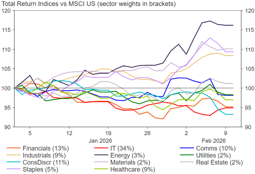 After US equities (S&P 500) declined 2.6% from 2 to 5 Feb, the index rebounded 2.0% during Friday’s 6 Feb trading session2. This initial mark down and even steeper sell-off in the MSCI USA / Software Net USD Index (-9.0%) from 2 to 5 Feb (although the software space did rebound 2.5% on 6 Feb)3 was a shock to risk appetite. Perhaps because of elevated valuations and exceptional returns to date, investors are becoming circumspect to any hints of adverse developments. What may be increasingly appreciated by market participants is that everything that is “AI / tech-related” may not continue to sustain strong returns. Returns for some market segments may moderate with rotational plays taking shape.