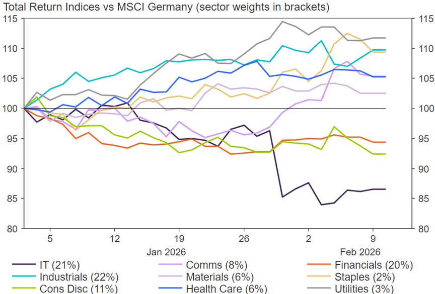 Germany continues to benefit from the performance of Utilities, Industrials, Healthcare, Materials, and now Staples. Some of these sectors continue to gain from the large fiscal spending on infrastructure.