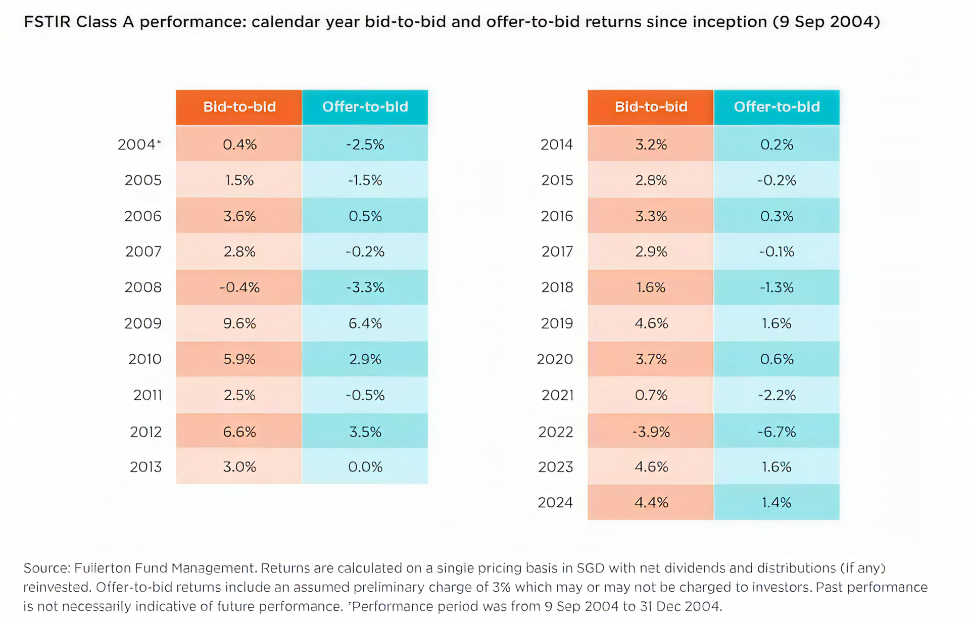 Source: Fullerton Fund Management. Returns are calculated on a single pricing basis in SGD with net dividends and distributions (If any) reinvested. Offer-to-bid returns include an assumed preliminary charge of 3% which may or may not be charged to investors. Past performance is not necessarily indicative of future performance. ^From 1 Aug 2023, the benchmark is 3M SORA + 0.60% p.a. From inception till 31 July 2023, the benchmark was 3M SIBID.