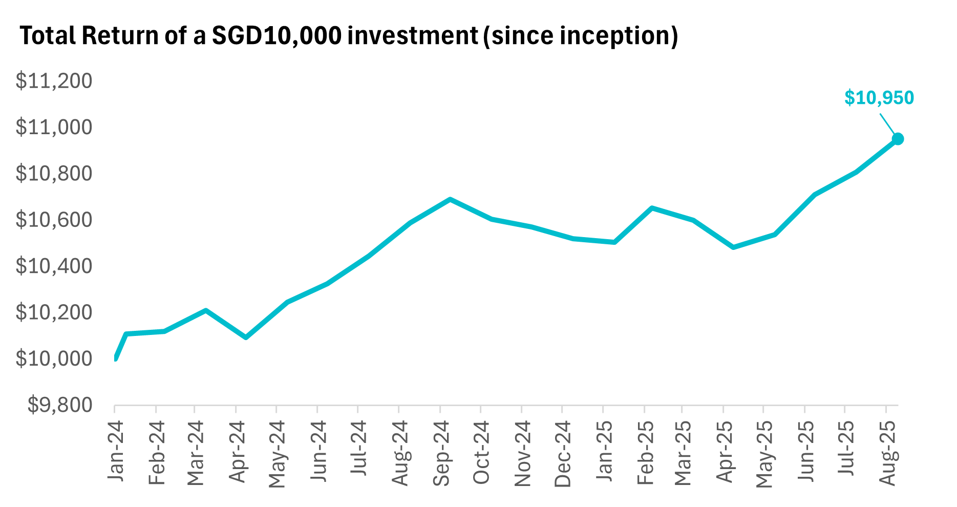 If you had invested SGD10,000 in the fund’s Class A (SGD-H) Distribution share class at inception and reinvested all payouts, your investment would have grown to SGD10,950 as at the end of August 20252.